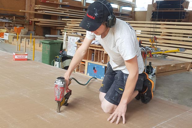 Mit dem Drucklufttacker befestigt Harder die Bekleidung auf der Holzständerwand.