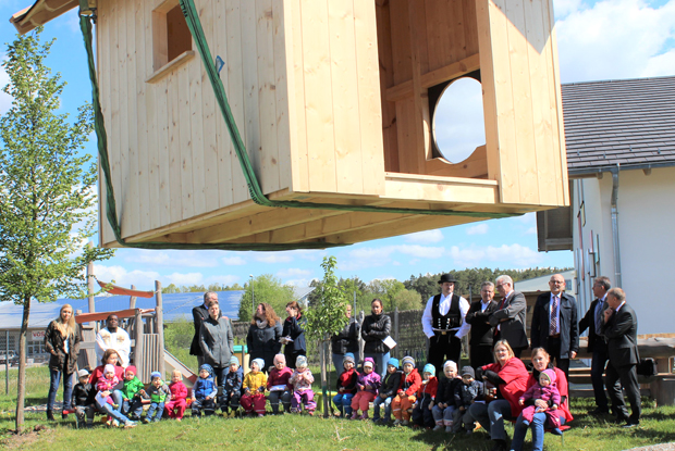 Im vergangenen Herbst auf dem Chamer Schmankerlmarkt hat der Kindergarten "Pusteblume" ein Spielhaus gewonnen. Nun haben es Vertreter der Zimmerer-Innung Cham und der Berufsschule in Wilting aufgestellt.