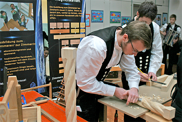 Bei der Ausbildungsmesse "Azubi live" haben sich am 9. März 2018 in Bad Kötzting 1500 Jugendliche über mögliche Lehrberufe informiert. Die Zimmerer-Innung Cham war mit einer Schauwerkstatt vertreten.