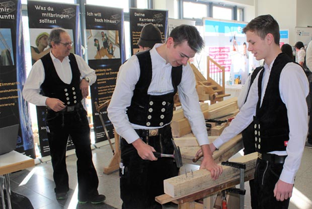 Die Zimmerer-Innung Cham präsentierte sich auf der Ausbildungmesse Azubi-live am 5. März 2020 in Cham. An deren Stand konnten die Messebesucher ihr Können an der Werkbank testen – natürlich unter Aufsicht der Profis in Kluft.