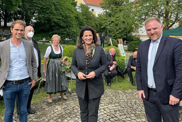 Vor kurzem besuchte Forstministerin Michaela Kaniber den Innungsbetrieb Holzbau Koch in Ainring (Zimmerer-Innung Traunstein/Berchtesgadener Land). Dort diskutierte sie mit Obermeister Martin Kollmeier, zwei weiteren Innungsmitgliedern und Rosenheims stellvertretendem Obermeister Franz Wörndl über die regionale Holzversorgung.